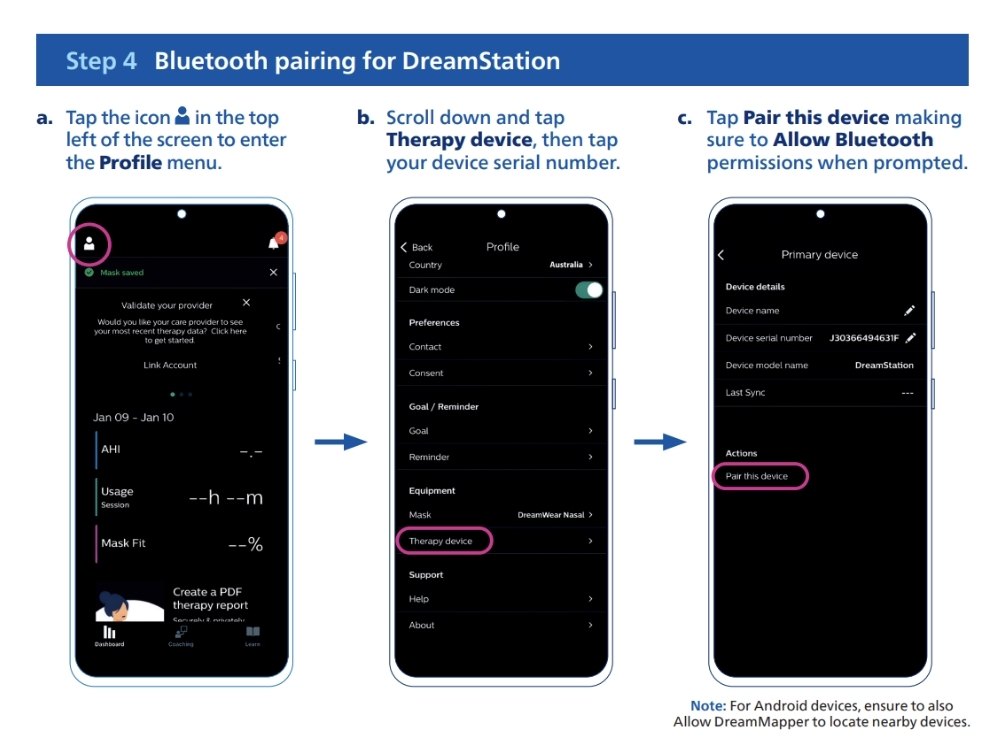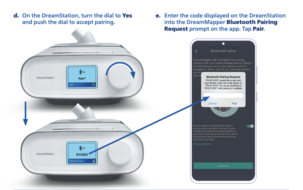 You need to ensure that your DreamStation is powered on and ready to connect. Your phone must have internet access and Bluetooth enabled. After you select “Pair this device,” the DreamStation will display a 6-digit code on its screen (as shown in step d). You need to enter this code into the DreamMapper app when the “Bluetooth Pairing Request” prompt appears.