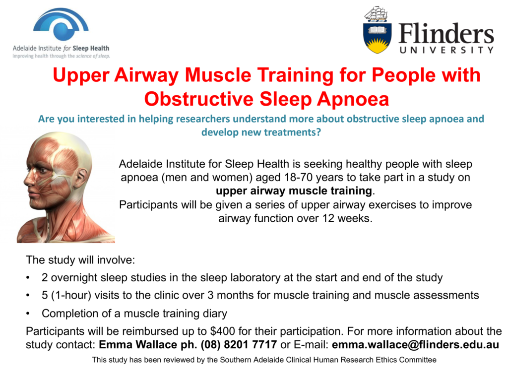 Adelaide Institute for Sleep Health is seeking healthy people with sleep apnoea (men and women) aged 18-70 years old to take part in a study on upper airway muscle training.